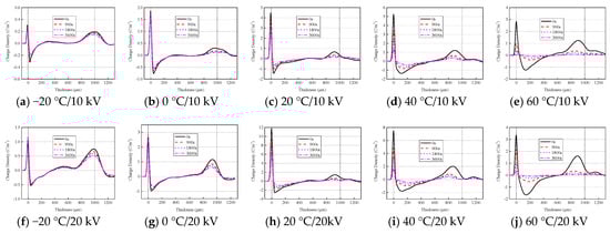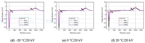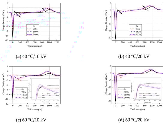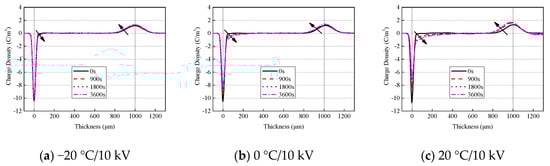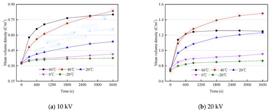 Figure 8 shows the mean volume density of the space charge at different temperatures and voltages. The mean volume density of the space charge increases significantly in the initial stage, and tends to be stable in the later stage. The higher the temperature and electric field stress, the more the mean volume density increases before the 600 s point. At the end of the voltage-on test, the mean volume density of space charge first increases, then decreases, with the increase in temperature (the maximum value appears at 40 °C). The mean volume density changes little at 60 °C in the later stage of the voltage-on test, indicating that the space charge distribution of the sample has reached stability.