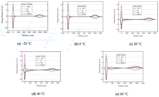 After the voltage polarity is reversed, the negative charge injected by the lower electrode is changed to a positive charge, and it is known from Equation (3) that the electric field distortion causes the electrode to inject more charge. The positive charge injected will neutralize the residual negative charge, and the space charge within the sample gradually changes from heterocharge to homocharge. Moreover, the amount and mobility of injected charge increases more at high temperatures, making space charge basically stable at +3630 s, hence the space charge distribution at both −30 s and +3630 s is symmetrically distributed.
