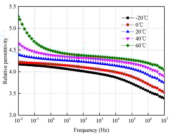 Thermal dissociation of impure molecules can be regarded as a slow polarization behavior. As relative permittivity is an important parameter reflecting polarization, the dielectric spectrum of the oil-impregnated pressboard at different temperatures was measured in the range from 10−2 Hz to 107 Hz, as shown in Figure 9. The relative permittivity increases with the increase in temperature, and also increases with a decrease in the frequency. The parameters in the DC steady state should be the same as that under low frequency. The relative permittivity at 60 °C increases the most in the range from 100 Hz to 10−2 Hz, followed by 40 °C, while the relative permittivity at low temperature increases little in that range. This indicates that polarization is easier to form at higher temperatures, and the impure molecules are more easily dissociated to form the heterocharge. This is consistent with the analysis results of Equation (3).