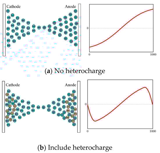 In summary, both homocharge and heterocharge exist in the oil-impregnated pressboard at the same time, but the former more so than the latter, so the test results show homocharge at different temperatures. Both homocharge and heterocharge increase with increasing temperature, but the magnitude of the increase of each is different. As the thermal dissociation of impure molecules at −20 °C, 0 °C, and 20 °C, is not obvious, the space charge accumulated within the sample is mainly homocharge. The schematic diagram of space charge distribution at high temperature, and the corresponding PEA measurement results (ignore the waveform of the interface charge), are shown in Figure 10. The heterocharge increases with the increase in temperature, and the heterocharge is mainly distributed near the interface. Therefore, the net charge near the electrode decreases with the increase in the temperature. As the heterocharge, and the charge recombination, increase at 60 °C, the mean volume density of space charge at 60 °C is less than that at 40 °C. During the voltage-on test, the negative charge injected from the lower electrode gradually decreases, while the positive charge formed by thermal dissociation gradually increases. Hence, space charge near the lower electrode first increases, and then decreases, at 60 °C.