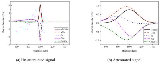 The signal near the upper electrode in the measurement results is different from that in the schematic diagram. This is because the space charge is measured by the PEA method. The sound wave propagating within the sample has both attenuation and dispersion, which causes the amplitude of the measured signal to decrease, and the pulse width to increase. The acoustic attenuation coefficient is obtained from the waveforms at the upper and lower electrodes in the reference signal [25]. The left side waveform in Figure 6e is mirrored as the upper electrode un-attenuated signal, as shown in Figure 11a. The attenuated signal is calculated with the attenuation coefficient and the un-attenuated signal, as shown in Figure 11b.