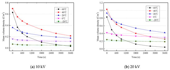 Figure 12 shows the mean volume density of space charge under different temperatures during a short-circuit. The mean volume density decreases gradually during a short-circuit, decreasing significantly in the initial stage. The rate and amplitude of charge decay increases with the increase in temperature. At the beginning of the decay process, the max mean volume density appears at 40 °C, indicating that the residual charge within the sample is largest at this temperature.