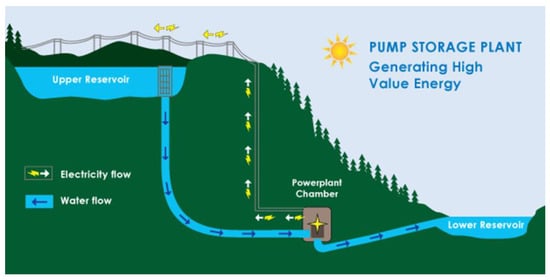 PHES is a mechanical device. Amongst other ESS technologies, PHES is the most mature and the largest commercially available. The general configuration of PHES consists of two water storage units with different elevations. Water is pumped to the top reservoir for storing purposes and is released to the lower reservoir during discharging [32]. Figure 2 obtained from [33] illustrates the general configuration of PHES, and Table 1 tabulates some of the operating PHES facilities across the globe [7,10,34].