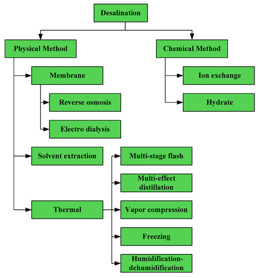 Figure 1 shows the classification of seawater desalination technology based on the separation process. Multi-effect distillation (MED), multi-stage flash, and reverse osmosis are the commercial desalination technologies widely applied in the industry. Total global desalination capacity was around 74.8 million m