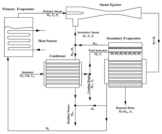 Mp) generated in the primary evaporator enters the steam ejector and expands as it exits the nozzle. The low-pressure region produced by this expansion vaporizes and entrains a secondary steam (