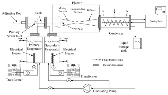 Figure 3. The experimental system was simplified to focus on the performance of the steam ejector. It mainly consists of an experimental ejector, a primary evaporator, a secondary evaporator, two electric heaters, two transformers, a condenser, a liquid storage tank, a circulating pump, and measuring devices. The experimental ejector mainly consists of four components: a diffuser, a constant area section, a mixing chamber and a nozzle with a mechanical adjusting mechanism. The mechanical adjusting mechanism can change the position of the nozzle exit in the mixing chamber of the experimental ejector. The diffuser, the constant area section, and the mixing chamber are connected by flanges.