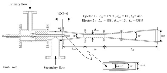 Figure 4. The NXP is defined as zero when the nozzle exit is set at the inlet of the mixing chamber. The experiments were conducted at three different positions of NXP = 50 mm, NXP = 100 mm and NXP = 150 mm.