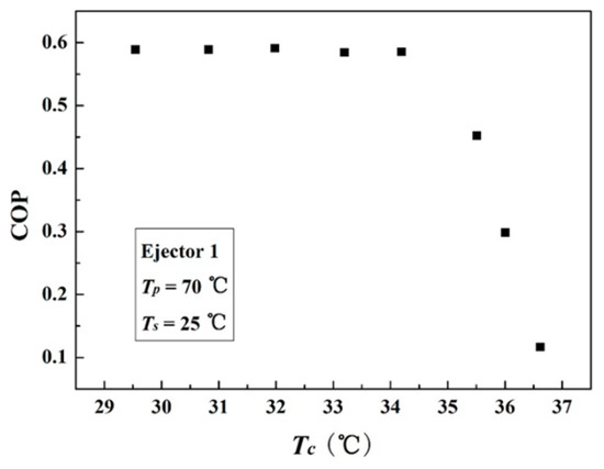 Figure 5 shows the experimental results at a primary steam temperature of 70 °C and a secondary steam temperature of 25 °C. It can be found that the COP remained constant at first and then declined rapidly with the increase of condensation temperature. When the COP began to decline, the steam ejector was at an unstable condition. The corresponding condensation temperature is called the critical condensation temperature,