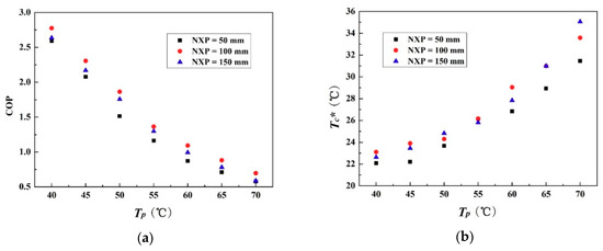 Figure 10 shows, the COP of the steam ejector when AR = 9 is higher than that of the steam ejector where AR = 6.25 in all cases. The maximum difference between the COPs of the two steam ejectors was 1.29 when the NXP was 100 mm and the primary steam temperature was 40 °C. In addition, the minimum difference between the COPs of the two steam ejectors was 0.25, when the NXP was 150 mm and the primary steam temperature was 70 °C. Furthermore, the COP of the steam ejector where AR = 6.25 was 0.04 when the NXP was 50 mm, and the primary steam temperature was 70 °C.