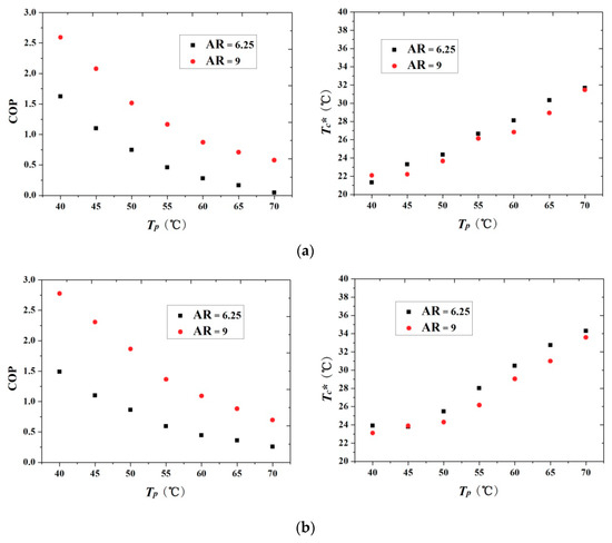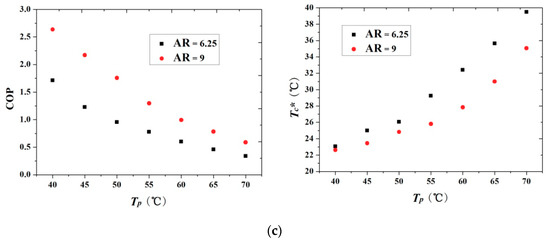 Tp = 65 °C. According to this analysis, reducing the AR could help to raise the critical condensation temperature, which was affected by the NXP. The AR had an opposite effect on the COP and the critical condensation temperature. Therefore, the comparison of the performance of the two steam ejectors should be based on the relationship between the COP and the critical condensation temperature. They had a relationship of restricting each other. According to experimental results shown in