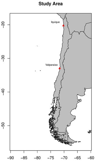 Buoy data used in the present study were provided by the SHOA (Spanish acronym of the Chilean Navy Hydrographic and Oceanographic Service). Data from two specific locations were used, i.e., Iquique and Valparaiso, depicted in Figure 1 together with the complete study area, from the Magellan Strait to the Peruvian border in the southern Pacific Ocean.