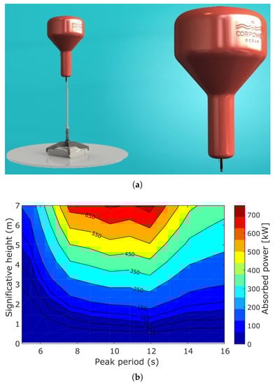 The illustration (a); and the power-matrix (b) of the Corpower device.