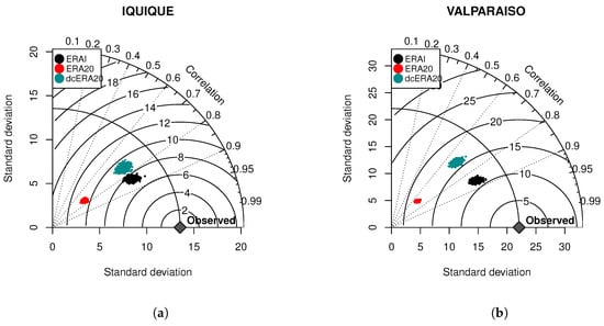 Taylor Diagrams for Iquique (a) and Valparaiso (b) buoys.