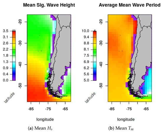- The average , and values for the entire area of study, based on the ERAI reanalysis, which provides a picture of the wave resource in the recent decades. In addition, the map with the average is useful to identify the highest energetic locations (see Section 4.2.1).