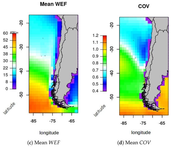 Ringwood and Brandle [14] showed that the maximum for Chile is 0.9, which is observed in the south of the Chilean coast, where the is about 121 kW/m. In contrast, the for Ireland is 1.8 (twice as high as the maximum for Chile), where the mean wave power is lower than for the southern Chilean coast: 95 kW/m. Therefore, Chile shows a high energetic and consistent wave resource, which is important in the process to harness and produce energy from ocean waves.