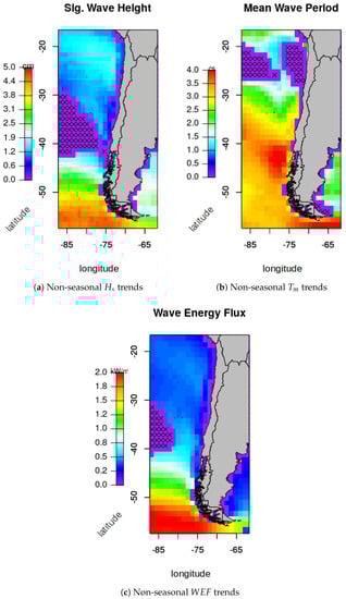 The map that illustrates the along the Chilean coast is shown in Figure 5d, where the spatial distribution of the is similar to that shown in [14], with values increasing towards the south. Additionally, one can observe a relation between the most energetic area in the south and the highest , and the decrease of both parameters towards the North. Consequently, the two locations under analysis in this paper (Iquique and Valparaiso) show reasonably low values (about 0.6). Note that, in the map illustrated in Figure 5d, and the maps shown in the following sections, purple cells with an x symbol mean that there is no significant variation at a 95% confidence level in that location.