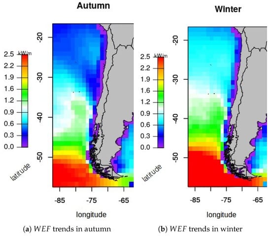 The calibration of the ERA20 reanalysis, described in Section 2.2, can also be classified according to the seasonal variations, creating a transfer function for each season, referred to as the seasonally-calibrated ERA20 (scERA20). Figure 7a–d shows the four maps corresponding to the decadal trends for autumn, winter, spring and summer, respectively, along the Chilean coast. The results obtained from the scERA20 show a relevant hot spot in the south of Chile, where the wave trend is particularly strong in autumn and winter (up to 2.5 kW/m/decade). This wave trend is still positive in the central and northern latitudes of the Chilean coast, although the wave trend is slightly weaker (about 0.5 kW/m/decade). Wave resource variations are slightly different in spring, where the positive wave trends can be observed in the south (up to 2 kW/m/decade) and north (about 0.5 kW/m/decade) of the Chilean coast. However, no significant variations are observed in the central latitudes, where the resource is consistent all over the 20th century, as illustrated in Figure 7c. Finally, resource variations over the 20th century are negligible in summer, as shown in Figure 7d.