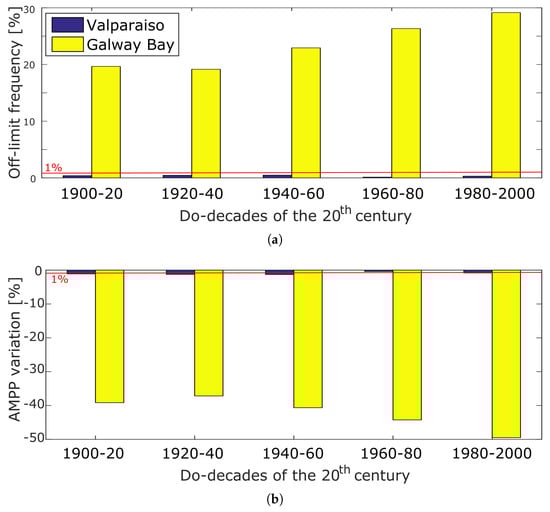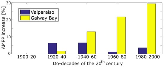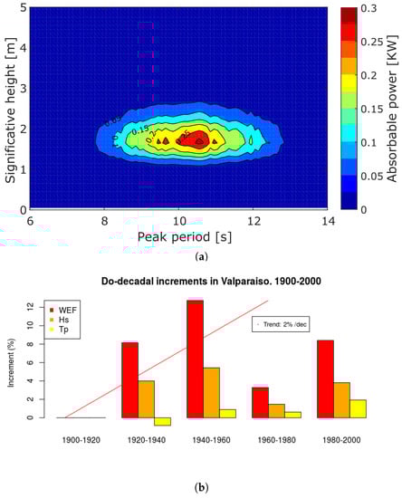 Decadal trends of the wave resource in Valparaiso are shown in Figure 6, where the evolution of the , and are given in kW/m/decade, cm/decade and centiseconds per decade (cs/decade), respectively. The is shown to increase slightly in the central and northern latitudes of Chile (1 cs/decade), while more significant increases (up to 5 cs/decade) are observed in the southern latitudes, as illustrated in Figure 6a. A similar pattern is also observed for variations, as shown in Figure 6c, where the increases up to 2 kW/m/decade. In contrast, variations of the mean seem to be negligible in the north of the Chilean coast, while the increases significantly (up to 4 cs/decade) in the central and southern latitudes. These results are consistent with the results shown in [24] for the and in [30] with respect to the . Trends of the are also studied over the 20th century, but are not shown in Figure 6, because the results do not show any significant variation at a 95% confidence level.