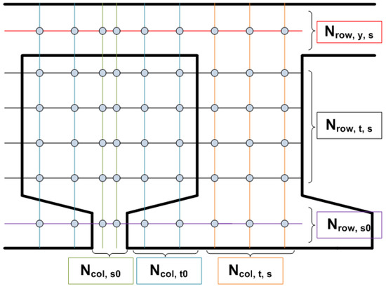 Presented parameters in Table 1 define the number of node columns and rows in stator regions, as can be observed in Figure 2. For open slot machines, is null. The armature current MMF sources are located at the north and south sub-elements of each element belonging to the teeth and are calculated by Equation (3).