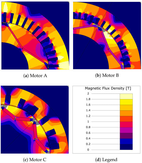 Magnetic flux density distribution for the three motors.