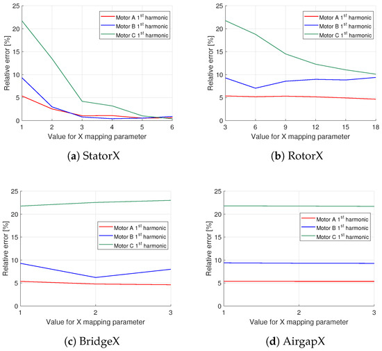 In Table 8, the relative errors between the results of the MCM and FEM are presented for the first and third time harmonics of the waveforms. Each row corresponds to results obtained when a MCM node mapping defined in Table 6 is employed with a determined X value. For example, Stator 1 means one value for all the stator parameters, and the other parameters are set to the default value.