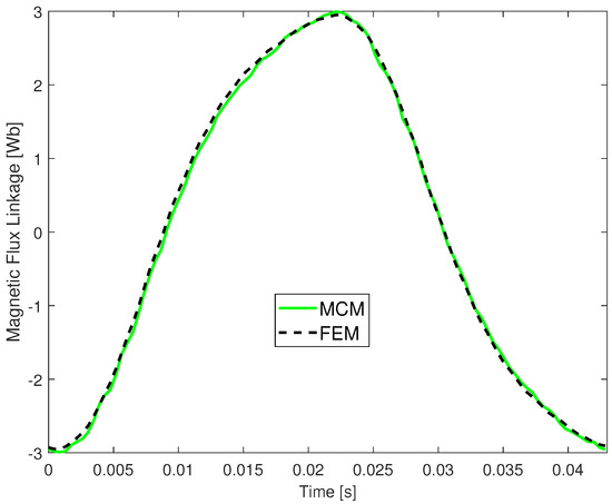 A key parameter for determining machine behavior is the phase magnetic flux linkage, [31]. The magnetic flux linked by each phase winding can be computed by Equation (8).