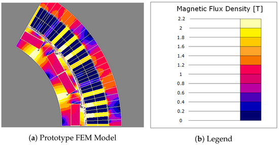 The prototype machine has been previously simulated via FEM at rated load. In Figure 14, it can be appreciated that the motor is magnetically saturated, reaching more than 2 T at some points.