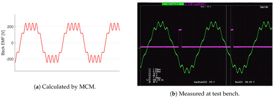 Finally, to visually compare the carried out measurements, in Figure 16, the obtained Back electromotive force waveform at tests and MCM is shown.