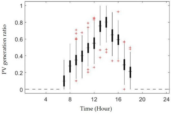 PV generation data during a year are calculated as a function of weather conditions, such as irradiance and temperature [32], using the weather data from 2016 on Manhattan, New York in the United States, a city in the mid-latitude region with four seasons [33]. Figure 4 shows the statistical information on annual PV generation.