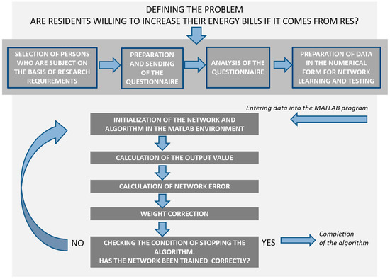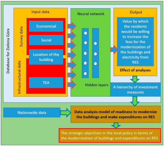 Modeling issues related to energy efficiency with artificial intelligence is becoming increasingly common due to the development and availability of modern technologies and the speed of processing information. Neural networks are used for the analysis of energy intensity of buildings [31,32], quantitative assessment of the technological solutions in the process of upgrading buildings [13], cost estimates of completed construction investments [33], and many other aspects of the construction and maintenance of buildings [34]. Typically, neural networks are used to model issues for individual buildings or groups of buildings with the same characteristics. In this article, we decided to use modeling with artificial intelligence for the whole city, divided into smaller units (quarters) depending on several characteristics: age of buildings, technologies, and the dominant construction method. Notably, the data input to the network included information not only about the inhabited buildings, but also information related to the issue of pollution and environmental protection, readiness to change, investment to increase energy and heat savings, and the assessment of the financial situation of the respondents. This approach reduced the knowledge gap concerning the citizens’ readiness to incur the financial expenses related to the use of RES energy. A description of the tools and procedures is presented below (Figure 5).