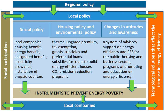One of the challenges in attaining energy efficiency in older cities is creating a system to counteract fuel poverty. This requires reducing energy prices and its availability (regulation) and more intensive use of infrastructure, expressed, among others, by a concentration of areas inhabited by humans [30]. The adopted objectives can be achieved by implementing a responsible urban policy that requires control, direct action, and/or economic incentive. Public institutions, on the one hand, are designed to monitor the situation; on the other hand, they should cooperate in providing support for people having problems with access to energy and heat due to economic reasons. A partnership of appropriate entities probides a better chance of effectively preventing fuel poverty.