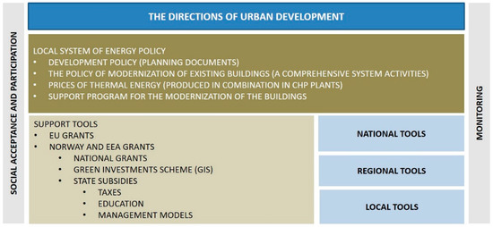 The demand to adjust urban development policy to the requisites of the European Union (EU) in terms of cutting greenhouse gas emissions is a challenge for Poland, as well as most of the states of Central and Eastern Europe. The requisites call for comprehensive actions that contribute to a decrease in operational demand for heat, electricity, and gaseous fuels. There are several methods for reducing energy consumption. One of them is raising prices, which may become, for some households, the driving force for modernization and the search for savings. However, considering diverse situation of households in Poland, some already have problems with paying for energy [1,2]. Drastically reducing expenses through savings diminishes their quality of life and can increase energy poverty and its impact on health [3]. Other methods of reducing the burning of fossil fuels include upgrading buildings and energy-saving activities of the residents and their self-awareness. The use of renewable sources energy is also essential [4].