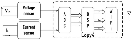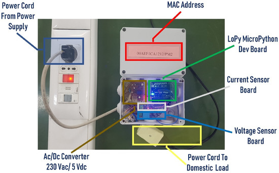 - A set of smart low-cost sensor nodes realized according to the current makers’ approach (i.e., with commercially available components). The nodes have to be installed between the power supply socket and a load or set of loads and measure the Root Mean Square (RMS) value of voltage and current, the demanded active power and the Power Factor (PF) of the load.