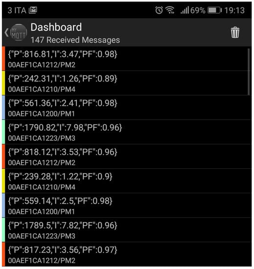 - If the MQTT connection is accepted, active power, current RMS values and power factor measured by the measurement algorithms are sent to the Broker for publication under a specific topic composed by the unique MAC address of the LoPy (for privacy and security issues) and PM (Power Meter) followed by an integer number (e.g., macaddress/PM3).