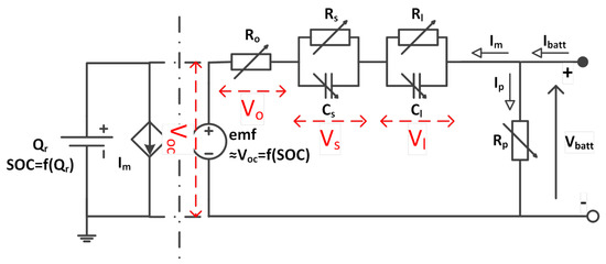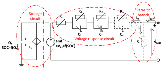 The last part is the parasitic branch, which is used to model the side reactions that induce loss of charge in the battery. There are many ways to model these battery losses. For example, Figure 1 shows the parasitic branch in the form of a resistance (). For both battery technologies, the basic construction of EECM is applicable, as shown in Figure 1.