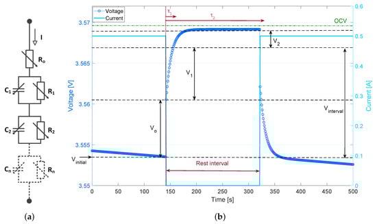 Generally, there is an expected time window for each of the voltage response. An EECM containing two RC-pairs is assumed. It is suggested that, within a five seconds time-window, the voltage boost () right after the load disconnection is induced by the ohmic resistance [18]. The time window for the rest of the gradual voltage increase caused by the RC pairs is called the time constant. The time constant reflects the rate of change of voltage; if the voltage changes faster, the time constant is smaller [19]. The increase in voltage right after the immediate voltage increase is the “short-term voltage response”. This short time interval () is expected to be around 10 seconds, and this voltage increase () is related to the first RC-pair, which is the , in Figure 2b [20]. The following increase in voltage () is then treated as the long-term voltage response after a long time interval (), which corresponds to the second RC-pair (, ), as shown in Figure 2b. It is possible to increase the number of RC-pairs and divide the voltage relaxation into more parts, with which the accuracy of the model is improved, such as the , in Figure 2b. Many authors suggest to model the lead–acid battery with first order RC circuit. However, for Li-ion batteries, all three orders of RC circuit model are commonly seen [12,21,22,23,24]. Eventually, the relaxation voltage will reach cte-OCV if the rest interval is long enough. However, it is necessary to strive an optimum balance between accuracy and complexity. Therefore, the study described in this paper has considered two RC pairs.