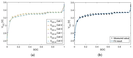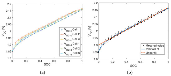 In this study, an equation is derived from the one proposed in [27]. This method is based on the principle that the losses incurred in the parasitic branch can be viewed as the Coulombic inefficiency of the battery. Therefore, this method models the parasitic branch in the form of the Coulombic efficiency as a function of and the battery current, as shown in Equation (10).
