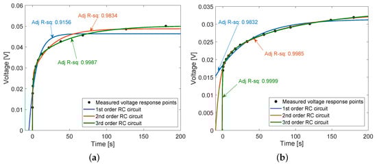 Curve fitting method was applied on each of the voltage relaxation results. The recognition of each part of the voltage and the corresponding time constant was done by nonlinear least squares curve fit in Matlab [20]. The distinct voltage and time constant values were then fitted into the RC circuit complete response equations to obtain the values of electrical elements in the model. The equations are listed below as Equations (5)–(9).