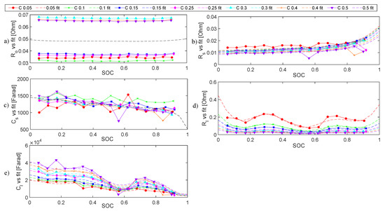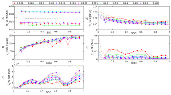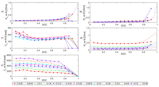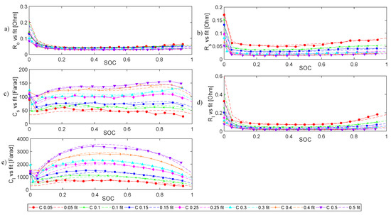 For both battery technologies, each of the internal impedances is known to be, to some extent, influenced by the , the temperature, and the current [28]. To obtain a proper dynamic battery model, a battery should ideally be tested with all three variables. However, the influence of operating temperature was not investigated in this study. All experiments were performed in a laboratory with the temperature controlled in the range of 20–22 C. Therefore, all experiments can be considered as under constant room temperature conditions. and current (in the form of C-rate) were the main operational variables considered in this study.