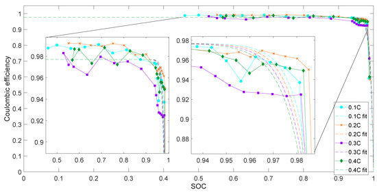 Then, the averaged integral recharge efficiency was fitted to Equation (10) to get the roughly estimated Coulombic efficiency as a function of and C-rates.
