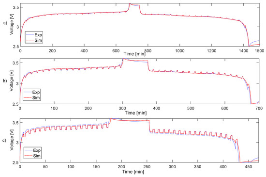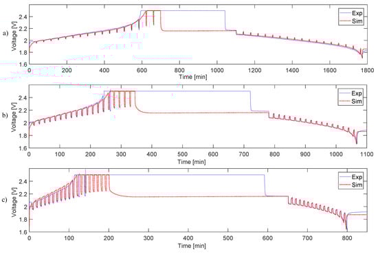The constant voltage (CV) charging stages were omitted from the calculation because, in the real measurement, the pause steps are accomplished by the tester, and it depends on the natural battery features. This step counting outcome accomplished by the tester in CV stage is unable to be repeated with the simulation. How it works is reflected in Figure 13 and Figure 14. For example, the comparison results of VRLA batteries is shown in Figure 13. The discrepancy in this figure between the experimental and the simulation results (e.g., 600–1000, 250–700 and 150–650 min in Figure 13a–c, respectively) are due to the step counting method difference. Therefore, the CV stages for both battery technologies are eliminated.