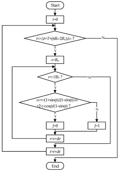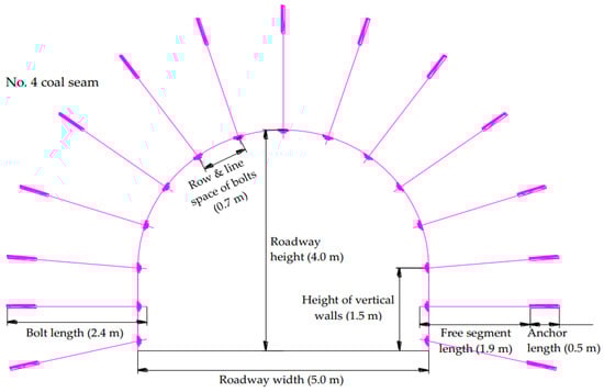 R0 of the roadway in the above analysis model was 2.5 m), presenting a roadway height of 4 m. In addition, by using the bolt and mesh supports, the anchor length and bolt length