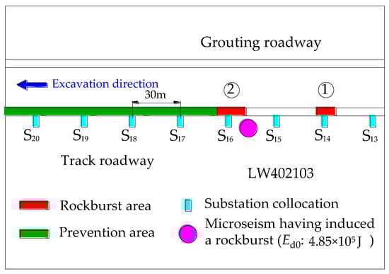 There was a monitoring and forecasting system adopted on site to ensure the mining safety of LW402103, combining with the Microseismic Monitoring System (named ARAMIS from Poland) and the On-line Measurement System of Bolt Resistances (Version No. YHY60). Therefore, the bolt resistances and microseismicity were all monitored in a real-time manner, to supply useful measurement results for analyzing the engineering case. Therefore, three-dimensional coordinates and energies of microseismic events can be acquired in real-time by the ARAMIS System. The substations, arranged on bolt tails in the sidewalls, were used for measuring bolt resistances. In addition, these substations, containing the stress sensor, data recorder, etc. (