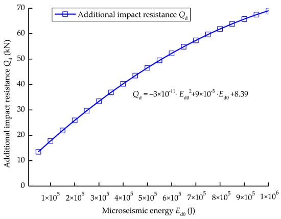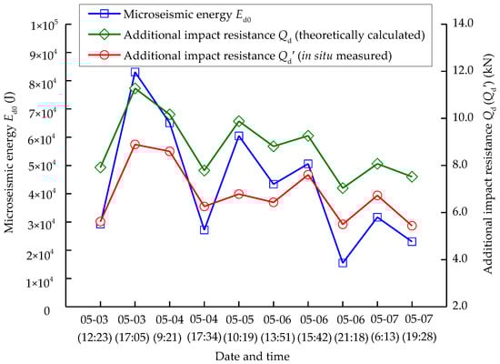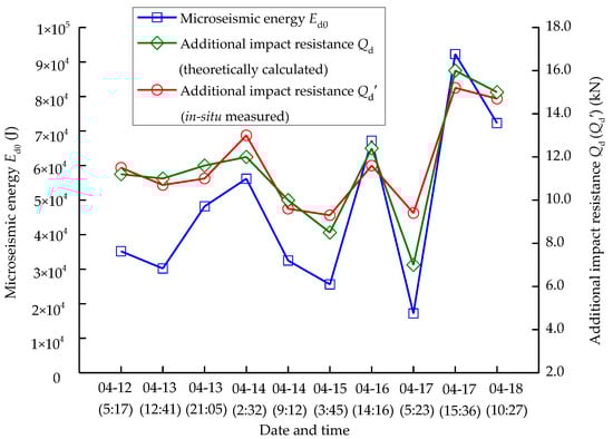 The overall real-time resistance Q was monitored by using the on-line substations about bolt resistances. Supposing that the overall real-time resistances were Q1 and Q2, separately before, and after, the microseismic event, the in situ measured Qd′ induced by dynamic loads can be calculated as Qd′ = Q2 − Q1. In addition, the theoretical Qd can be obtained according to Equations (11)−(18) and (26), based on monitoring data of microseismic events. Furthermore, the distribution of microseismic energies as well as the theoretical Qd and in situ measured Qd′ in a time period can be attained by calculating and processing the monitoring data about bolt resistances and microseisms.