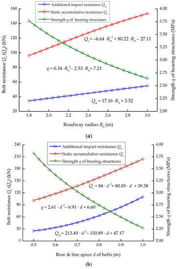 As the R0 and d increase, q reduces gradually, while Qs and Qd increase. When d grows from 0.5 m to 1.0 m, Qd and Qs increase by 84.67 kN and 102.72 kN, respectively, while q decreases by 1.55 MPa. Moreover, when R0 grows from 1.8 m to 3.0 m, Qd and Qs increase by 20.59 kN and 57.20 kN, while q decreases by 1.12 MPa. The smaller the radius of roadway and bolt spacings are, the greater the strength of the bearing structures while the lower the static cumulative resistance and additional impact resistance, which can enhance the supporting effect to a certain degree. Additionally, the bolt spacings exhibit more significant influences on the loading of the bolted supports than that of the roadway radius.