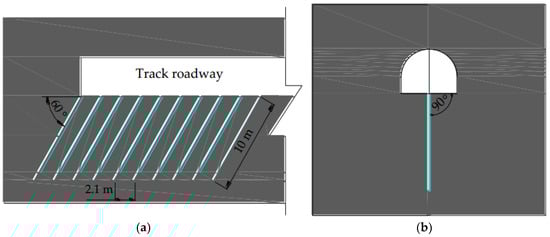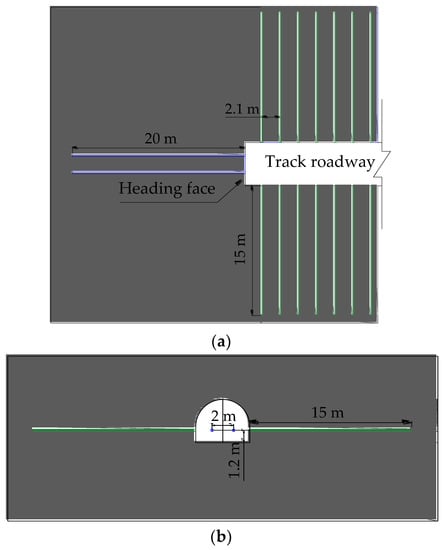 Considering the construction difficulty degree of preventative measures and the necessary cooperation with the tunneling process, the simplest and effective methods for the track roadway were using the large-diameter destress boreholes and decreasing the bolt spacing. After the rockburst on 18 April 2014, the large-diameter destress boreholes were carried out on the track roadway of LW402103. The locations where destress boreholes were drilled in the coal seam included the heading face and sidewalls of the roadway in the top slice (