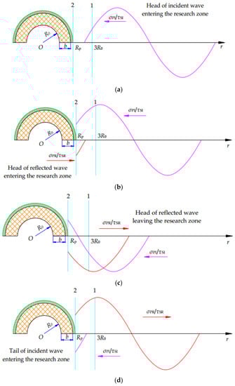 The first time period (0 < t ≤ (3R0 − Rp)/cP), as shown in Figure 3a, starts from the moment when the head of the incident wave arrives at boundary 1, to the head of the incident wave arriving at boundary 2. Spreading inwards, the incident wave has a time-variant range of influences. The unit bodies between boundaries 1 and 2 are impacted by the incident wave successively, so some parts of the research region are influenced by the incident P-wave. Besides, the influenced areas vary with time t. For example, the distance lP1 that the incident wave propagates in the analysis region meets the condition of lP1 = cP·(t − 0) = cP·t, and then the affected zone is in the range from 3R0 − lP1 (namely 3R0 − cP·t) to 3R0, at a certain moment t (0< t ≤ (3R0 − Rp)/cP). Therefore, the dynamic stress attributable to the incident P-wave meets the condition of σPI = σPI (r,t) (Equation (2)) to the region ((3R0 − cP·t) ≤ r ≤ 3R0), while σPI = 0 for the remainder of the analysis region (Rp ≤ r < (3R0 − cP·t)). Furthermore, no analysis region was impacted by reflected waves in the first time period, so the corresponding stress imposed by reflected waves satisfies σPR = 0.