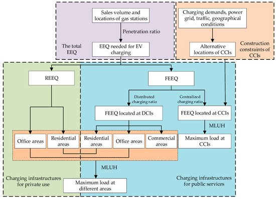 Different from the planning of a traditional distributed power network, the planning of EVCIs must solve the key problem of charging load prediction. Only when the loads of CCIs and DCIs are calculated, can the locations and capacity of EVCIs can be determined. The main idea of the load prediction method is to convert the current sales volume of fuel of all gas stations in the planned region into the equivalent electric quantity (EEQ) needed by EV charging based on the energy equivalence rule. Then EEQ is divided into rigid equivalent electric quantity (REEQ) and flexible equivalent electric quantity (FEEQ). After the alternative scheme of locations of CCIs is defined, the maximum loads of CCIs and DCIs located in different areas can be further calculated. The proposed method is applicable to the charging load prediction of private vehicles in the large-scale stage of EVs. The means and parameters are shown in Figure 2 and discussed in detail as follows.