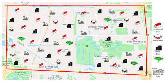 Based on the current level of development of EVs, the following figures and tables give an illustration of charging load prediction by the energy equivalence method. The planned area with a maximum horizontal width of 5 km, a vertical maximum width of 2.7 km, and a total area of approximately 12 square kilometers is located in the middle of four main roads in Beijing. There are 46 typical load regions, 7 gas stations and 4 optional locations of CCIs. The region has a relatively high economic level, a large number of EVs, adequate spare capacity, and the highly reliable power supply. The geographical locations of different areas, gas stations and CCIs are shown in Figure 6.