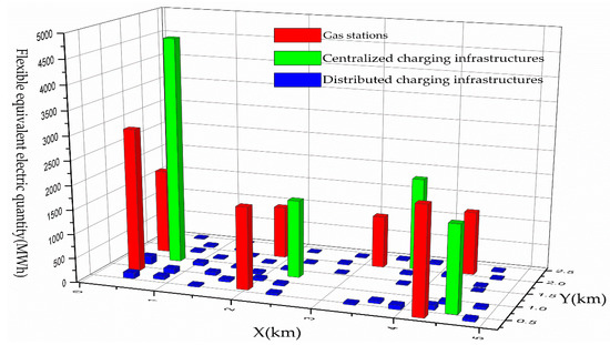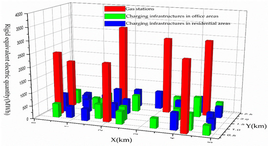 It is assumed that EV owners replenish fuel at the gas stations near their residential areas or office areas before replacing EV. The gas station in the planned area allocates REEQ to the charging infrastructures in the nearby office and residential areas, and the distribution method adopts the EPLD criterion. The EPLD criterion means that the gas station only allocates electricity to the charging infrastructures in office areas and residential areas within the maximum distance from it and the allocated electricity is inversely proportional to the distance. If the distance is larger than the maximum value, the charging infrastructure will share no consumption from this gas station. The REEQ distribution is shown in Figure 3.